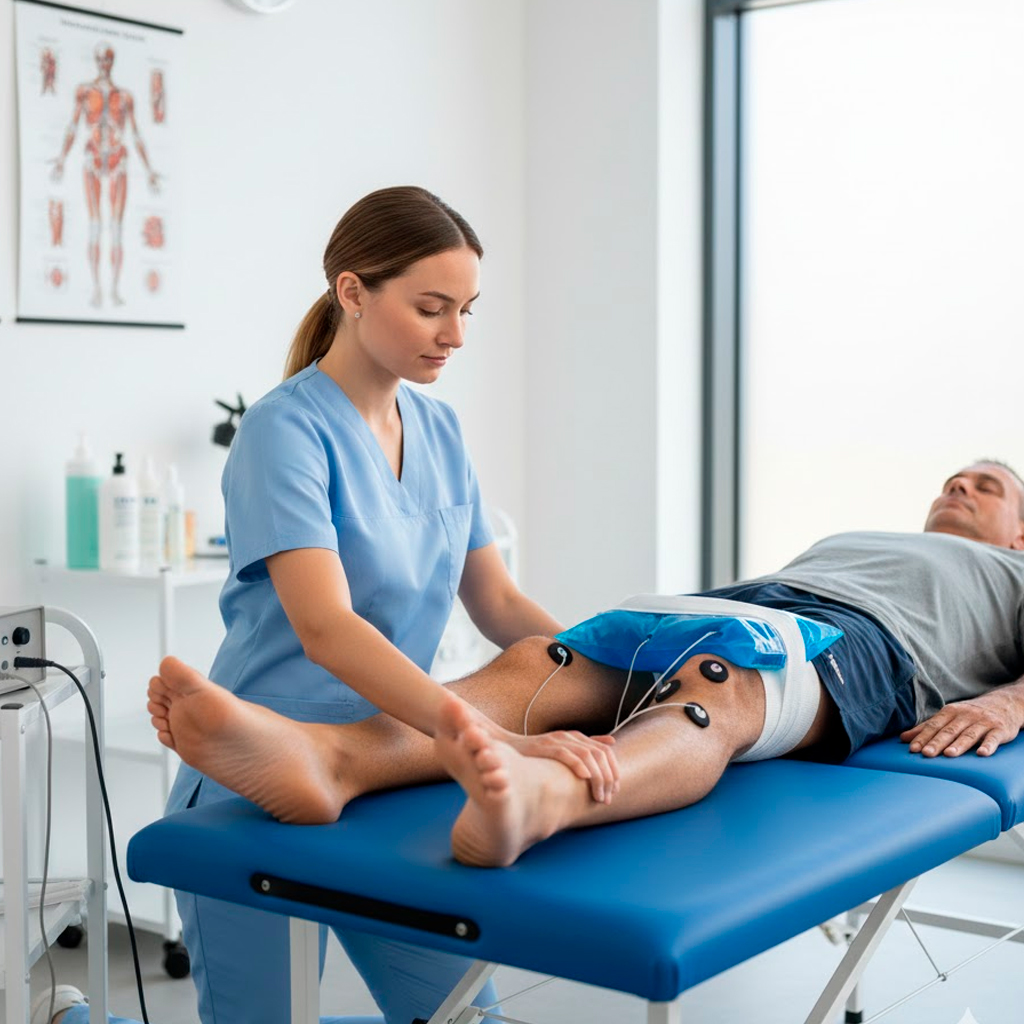 • Utilizam-se recursos como gelo (crioterapia), eletroterapia (TENS) e terapia manual suave para reduzir o desconforto e o edema inicial.